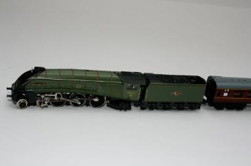 If the weather was wet, I would head for the bridges on Long Road which afforded a great view of passing trains. Sunday mornings were particularly enjoyable, as the trains working the route included some of the premier locomotives from the King’s Cross depot, doing a trial run after regular maintenance, a ‘running-in turn’. This left King’s Cross as 6:50 am and returned from Cambridge at 10:05 am, so I had two viewing opportunities. These elegant locomotives were fitted with distinctive and melodic chime whistles, which would fill the flatlands around Hobson’s Brook with noise, a sound once heard, never forgotten. The locomotives used on this turn were invariably Gresley A4s, streamlined engines known to us as ‘streaks’. We saw named trains such as ‘Sir Nigel Gresley’ and ‘Dwight D. Eisenhower’ and the record-breaking ‘Mallard’.