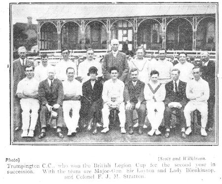 The third index reference at the Cambridgeshire Collection was to photographs which had been published in Cambridge Independent Press , 19 August 1927, p.10. One was of the Trumpington cricket team, winners of the British Legion Cup, and the second was of Lady Blenkinsop presenting the Cup to G. Smith, the Trumpington captain. The match had been Trumpington, the holders of the British Legion Cup, playing Cottenham in the British Legion (Lord Lieutenant’ s Cup) final at Fenners in August 1927. Trumpington won by six wickets. It was mentioned in the match description that G. Smith was a Town footballer.