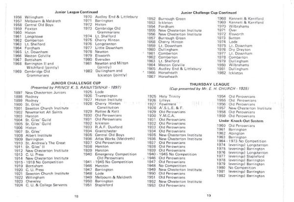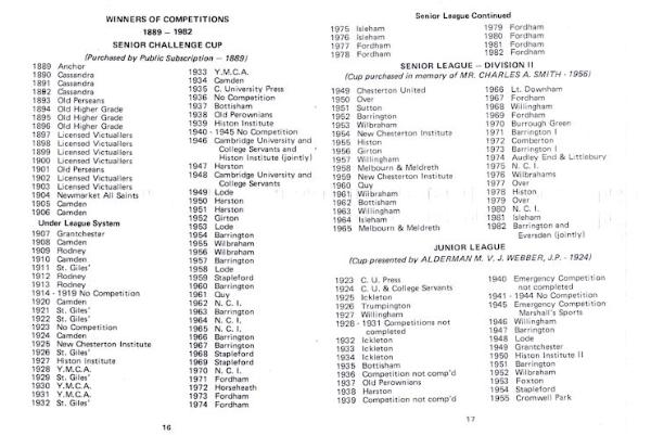 There were no more references to photographs of Trumpington Cricket Club team members in the Cambridgeshire Collection index to act as guides to further significant events in the club history. However the Cambridgeshire Collection held an incomplete set of the Official Handbook of the Cambridgeshire Cricket Association from Season 1952 to 1993. It was hoped that this would be a useful tool to discover details of more recent club information. This proved to be the case. The Handbook listed details such as contact details of the club secretary, competition registrations with Junior League Division members and Junior Challenge Cup Draws, where relevant, plus there was a cumulated list of Cambs. Cricket Association winners.