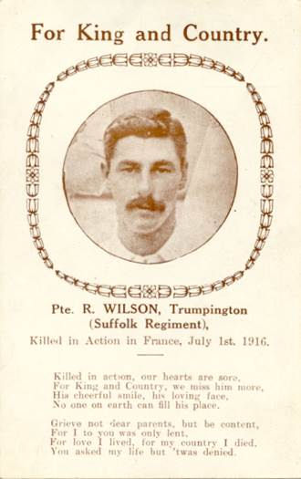 Card produced in memory of Private R. Wilson: “For King and Country, Pte R. Wilson, Trumpington (Suffolk Regiment), killed in action July 1 1916, card produced in his memory with portrait and verse”. Cambridgeshire Collection. Cambridge Central Library, Y.Tru.K16, 23429.